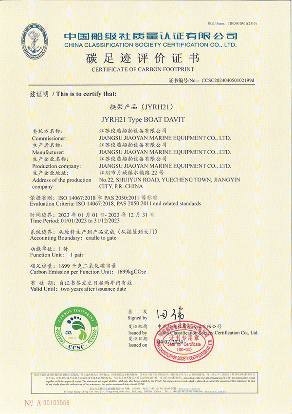 江苏佼燕高速救助艇艇架取得EC证书