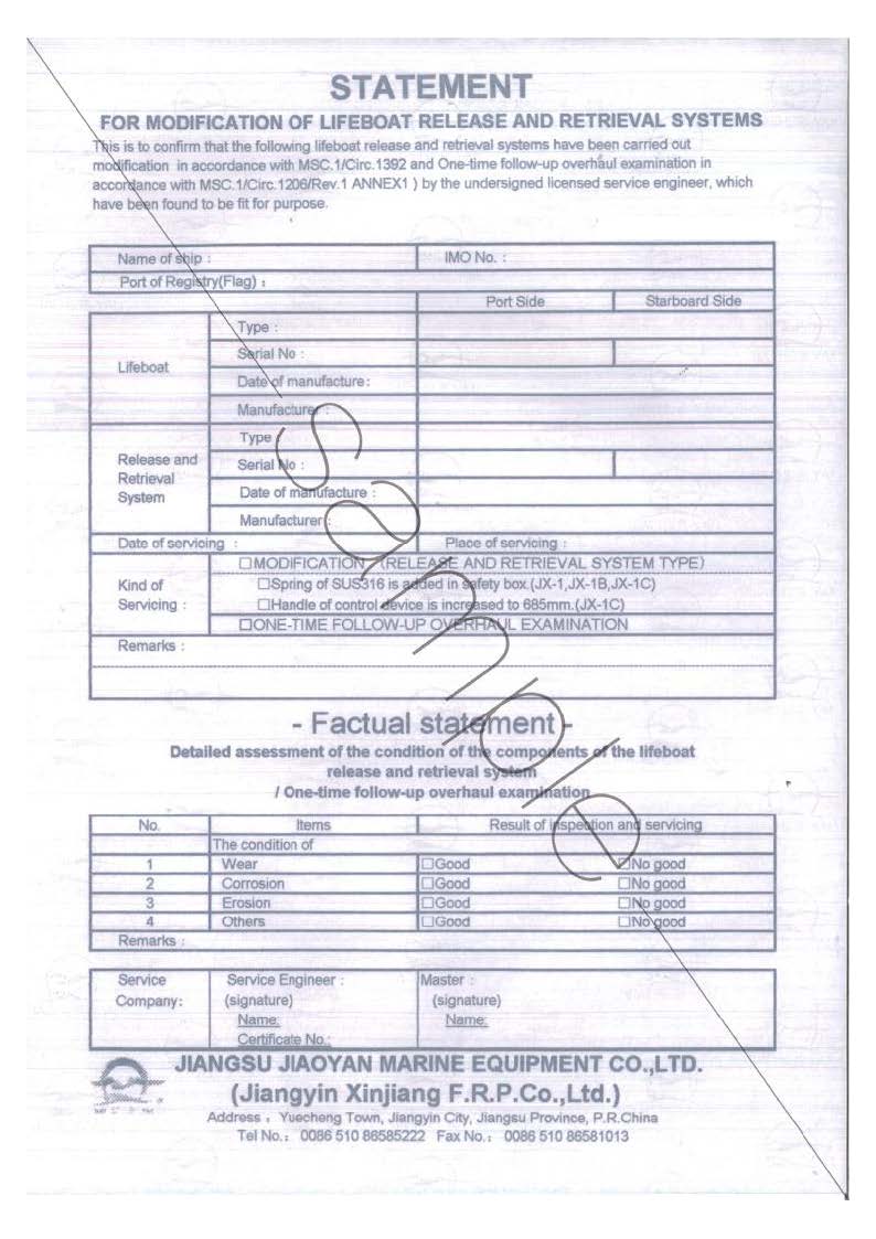 近期,发现国内存在一些服务公司为牟取私利,置船员生命安全于不顾,未经我公司专业培训和认可,擅自对我公司(AK在线注册/江阴新江玻璃钢有限公司)生产的救生艇设备进行救生艇吊钩改造,同时签发伪造的声明,因此引起了重大的安全事故.重要提示:AK在线注册(江阴新江玻璃钢有限公司)对一切未经本公司专业培训和认可的服务商提供的对本公司产品的所有服务不承担任何责任,并保留对其追究法律责任的权利.